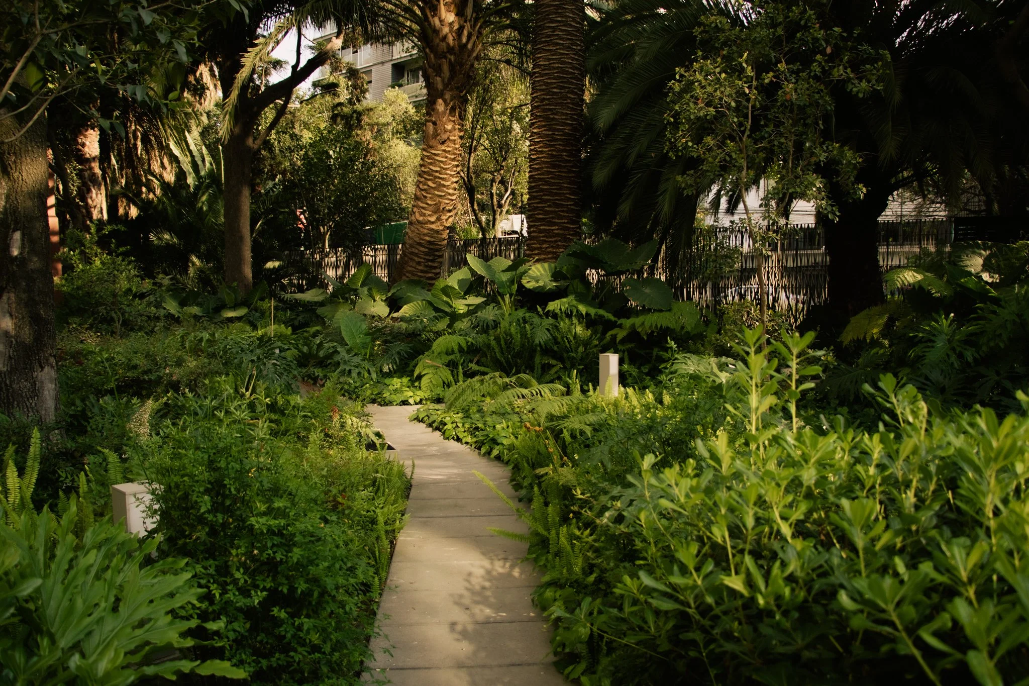 “Entre casas y torres se proyectó un generoso jardín que brinda sentido de cohesividad y comunidad al conjunto. Su paisaje, compuesto de aquellos árboles y palmeras oriundos al predio y una paleta complementaria de helechos y alocasias, consigue entramar senderos y accesos peatonales para propiciar un territorio neutro, a la vez privado y compartido, con el potencial de albergar los intereses comunes de los vecinos que habitan el conjunto; y cuya vastedad —que representa el cincuenta por ciento del área en planta baja— resulta ideal para cobijar actividades grupales y suscitar encuentros espontáneos. El jardín es, en suma, ámbito de serenidad, silencio e intimidad. Un vallado natural que mitiga la polución, fomenta la resiliencia comunal, y amortigua el roce entre los residentes y la cotidianidad del barrio.” -JSA