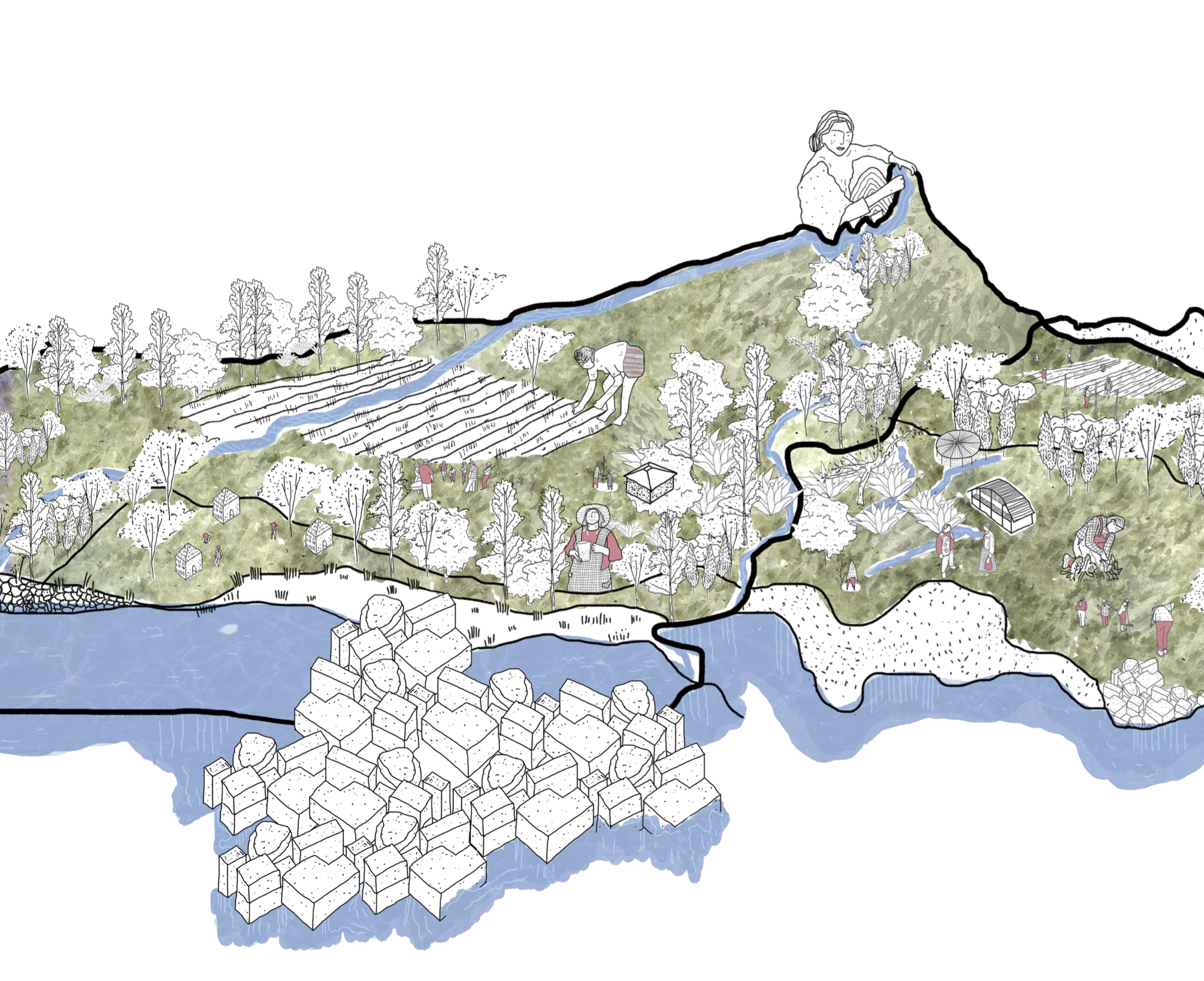 Cuestionar lo marginal implica un rescate de los lugares olvidados. Lo marginal tiene una connotación negativa, una definición clara entre dos situaciones contrastantes. Desde el margen de una cuenca intentamos suavizar las diferencias entendiendo que todos habitamos el mismo territorio, bebemos la misma agua y comemos de la misma tierra, creando a partir de dos centros, un nuevo núcleo de fertilidad.”